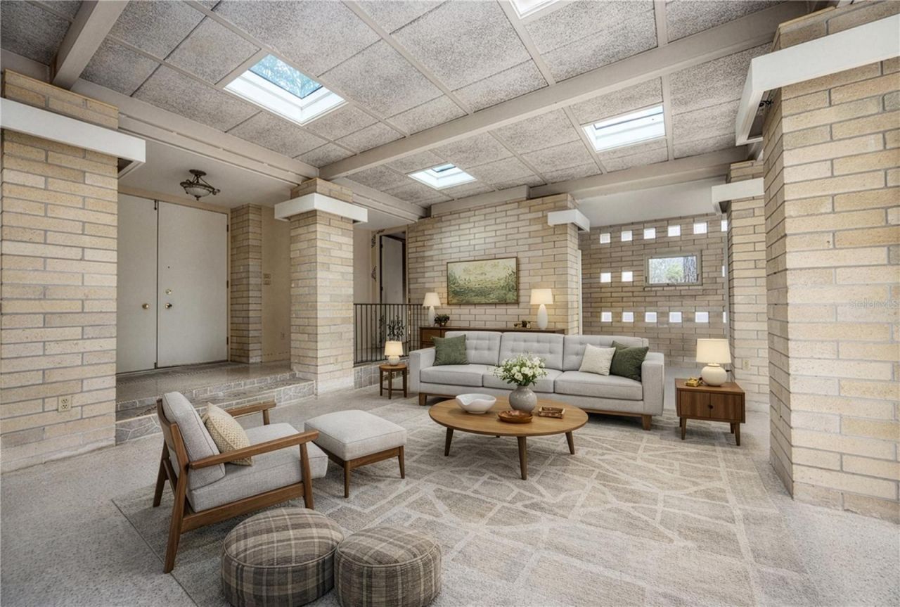Some photos have been virtually staged. A rare, single-story Mid-Century Modern pool home on an acre in NW Gainesville's Masonwood neighborhood. Built in 1964 and designed by Alfred Browning Parker, known as the Frank Lloyd Wright of Miami, this home seamlessly combines indoor and outdoor living. Modern design combines with a mix of natural materials including Ocala block, concrete, terrazzo and glass. The large open spaces are full of natural light and have views of the private courtyards and gardens, providing shade, privacy and a connection to the outdoors. The gated entry courtyard has a waterfall flowing into the koi pond and a covered walkway to the large double entry doors. Walls of glass, skylights and custom light fixtures fill the living space with light. The large multi-use living room incorporates space for dining, music, an office and conversation areas, all with views of the garden. To the left of the entry are two bedrooms and a guest bathroom. The first bedroom has an entire wall of sliding glass doors that opens to a second private courtyard. The guest bathroom has a step down Roman tub and plenty of storage with an adjacent linen closet. The second bedroom is currently configured as a den with a closet, bookshelf, fireplace and large sliding glass door. The front wall of the Living Room has updated double paned windows, like the rest of the home. It also has glass blocks that create a very unique pattern of light in the Ocala Block wall. To the right of the foyer is a casual dining area with sliding glass doors to the rear covered porch. Around the corner is the updated Kitchen with a built-in pantry, center island and solid wood 42 inch cabinetry, Quartz countertops and stainless steel appliances. There are two large windows overlooking the rear porch and custom lighting throughout. The home is well loved and maintained. New HVAC 2024. Water Heater 2025. Roof 2024. Across from the Kitchen is the laundry room which may be the biggest in town. It comes with a washer and dryer and lots of additional cabinets for storage. Off the laundry room is a three car, rear entry garage. Each bay has a separate door and the oversized space includes a workbench and storage. Open to the kitchen is the family room with many windows and access to the rear porch and a courtyard off the laundry room/garage. The rear porch is covered, screened and provides outdoor entertaining space. The pool and spa are saltwater. Continuing around the corner is the Primary Suite with walk-in closet, en suite bathroom and large bedroom with a wall of sliding glass doors overlooking the deck and pool. The Primary Bathroom has double sink vanity, updated fixtures and large shower. Past the Primary Suite is a large 4th Bedroom or second en suite Master Bedroom. This space has a large bedroom, office/nursery or flex space with sliding glass doors to the pool area and spa, a private exterior entrance and the en suite bathroom with water closet, tub/shower and solid wood vanity. Masonwood is located 1 mile north of the University of Florida. It is biking distance to Westside Park, Loblolly Woods trails and boardwalks and the 300 Tennis Club. Perfect for quiet walks, it is not on a busy through street. Less than a 5 minute drive to Millhopper Publix, Fresh Market, shops and area restaurants. The home sits on a 1 acre, low maintenance lot. A shed provides additional storage. Zoned for Littlewood Elementary, Westwood Middle and Gainesville High Schools. No HOA.