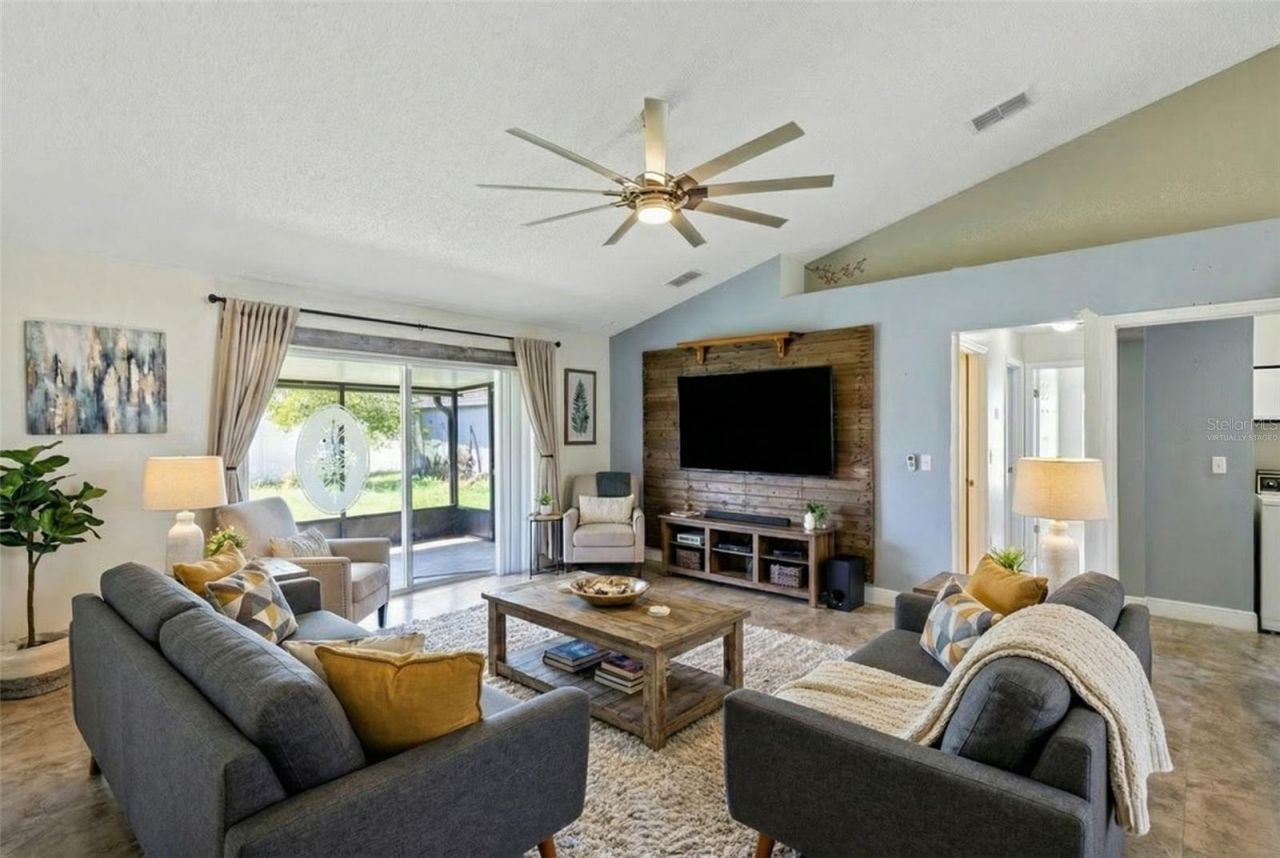 One or more photo(s) has been virtually staged. Welcome to 853 Franconville Ct, Kissimmee, FL, a charming 3-bedroom, 2-bath home with a bonus flex room located in the growing Poinciana community. This inviting home features high ceilings that create a bright and open feel, along with stylish design touches including a decorative pallet accent wall and a sliding barn door off the kitchen leading to the bathroom, adding both character and functionality. The home is also equipped with solar panels, helping improve energy efficiency and potentially lower utility costs.The flexible bonus room offers the perfect space for a home office, playroom, guest space, or additional living area to fit your needs. Step outside to enjoy the larger fenced backyard with a white vinyl privacy fence, ideal for pets, entertaining, or relaxing outdoors.Conveniently located near Poinciana Parkway for easy commuting, this home is just minutes from shopping, restaurants, schools, parks, and Poinciana Medical Center. You'll also enjoy nearby recreation at Vance Harmon Park, which offers sports fields, walking trails, playgrounds, and community events.With its versatile layout, stylish touches, energy-saving solar panels, and spacious backyard, this home offers comfort and convenience in a great location.